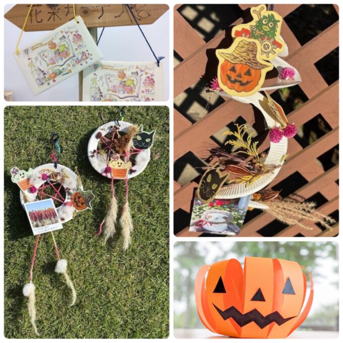 園内で採れた葉っぱやドライフラワーを使って、ハロウィーンポシェット、かぼちゃマンぼうし、かぼちゃマンぼうし、おばけの夢ふわキャッチャー、ゆらゆらおばけモビールを手作りします♪ ポシェットやぼうしは、身に着けて園内を歩けばハロウィン気分UPですね~!!