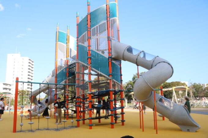県内先駆けてインクルーシブ遊具を導入した公園のひとつ。
