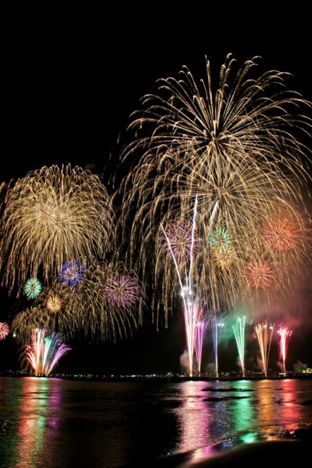 直径約480mを誇る2尺玉、色とりどりのスターマイン、海に映える花火の光…