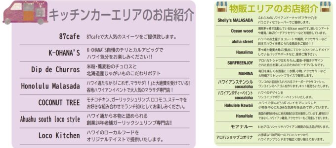 ハワイの雑貨やアクセサリー、アロハシャツ、ハワイアンドーナッツやチョコレートなど、ハワイ関連のお店がズラリと並びます♪ハワイアンフードやスイーツが楽しめるキッチンカーも!いろいろなものを見て、食べて。子どもたちも喜びそうですね♪