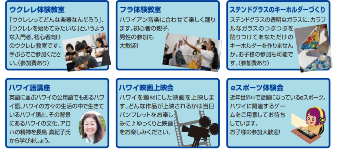 そのほか、ウクレレ体験教室やハワイ語講座、ハワイ映画上映会など、パパ、ママの興味がそそられるワークショップもそろっています。