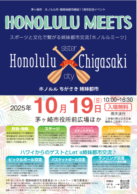 2025年10月19日(日)10:00~16:30、茅ヶ崎市役所前広場ほかで、茅ヶ崎市とホノルル市の郡姉妹都市締結11周年記念イベント「ホノルルミーツ2025」が開催されますよ。「ホノルルと出会う」をテーマとし、「スポーツ・文化の市民相互の交流の場」コンセプトにした体験型イベントです!