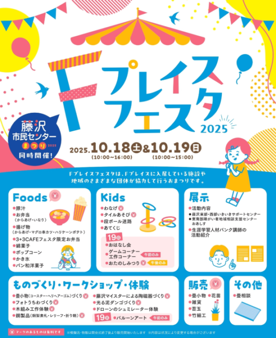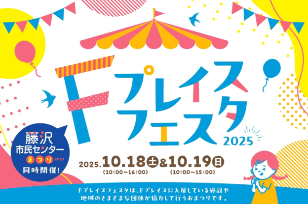 2025 年10月18日(土)、19日(日)の2日間、Fプレイスで「Fプレイスフェスタ」が開催されますよ♪Fプレイスに入居するさまざまな施設・団体が一緒に協力して開催するお祭りで、内容も盛りだくさんです。親子やお友達と一緒に、楽しんじゃおう!!