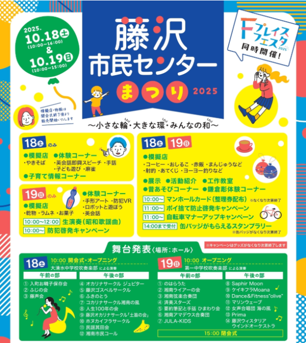 Fプレイスフェスタ:段ボール迷路、輪投げ、工作など、楽しいイベント盛りだくさん。藤沢公民館まつりも同時開催!親子で一日中楽しめます♪[2025年10月18日(土)、19日(日):藤沢市]