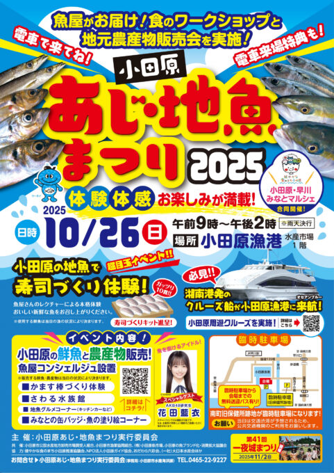 今年のテーマは「体験」、「体感」。魚食にまつわるワークショップが複数開催されます!寿司づくり体験や、かます棒づくり体験をはじめ、オリジナルお魚缶バッジ作りや活きた魚に触れる「さわる水族館」など、楽しい体験が満載。さらに今年は、「小田原・早川みなとマルシェ」も同時開催!小田原の地魚に加え、地元で収穫された新鮮な農作物の販売も予定です。