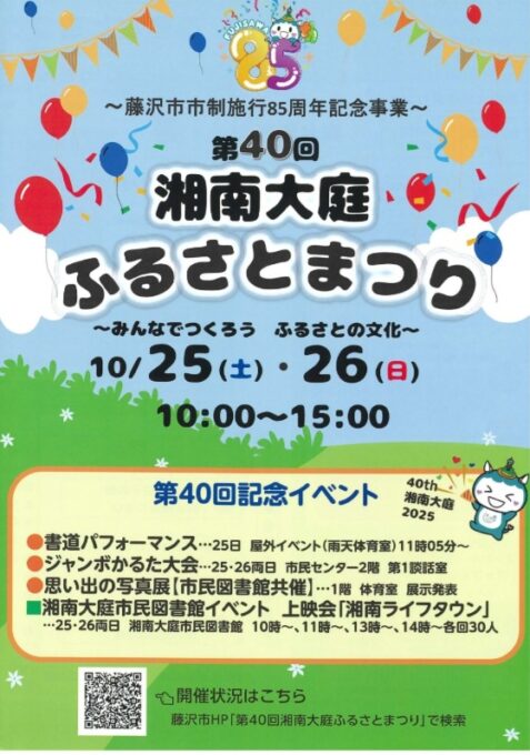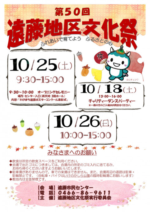 子どもから大人まで、みなさんが楽しめる模擬店や発表が盛りだくさん!25日は秋葉台中学校吹奏楽部の演奏、子ども太鼓舞台など。26日はラジオ体操(10時~)、ふじキュン♡とゲーム大会など。