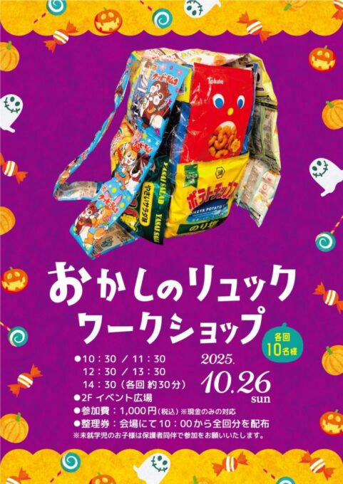 おかしのリュックのワークショップ開催! ※整理券を10:00から全回分を配布 ※参加費:1000円(税込) ※未就学児のお子様は保護者同伴