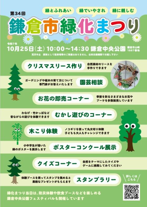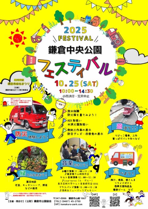 防災体験ができるほか、ちびっこ電車や工作など子どもが喜ぶイベント盛りだくさん!その他、軽食の販売やライブも開催します。鎌倉市緑化まつりも同時開催。