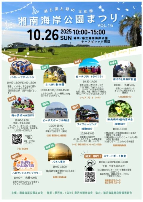 パイレーツチャレンジ、ふれあい動物園、ビーチフラ、凧作りと凧揚げ教室、ハロウィンスタンプラリーなど、楽しい催し物が盛りだくさんのイベントです。 ※参加費がかかるイベントもあります