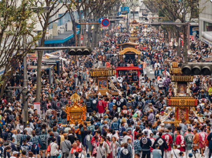 約50基のみこし・山車が集結!威勢のいい掛け声やお囃子とともにパレードする様子をお楽しみください。