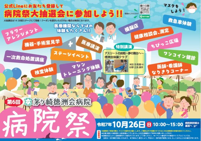 ステージイベント、医師・看護師なりきりコーナ―(小学生まで)、救急車体験、ちびっ子広場など、子どもも楽しめるイベント盛りだくさん!!模擬店も出店します。