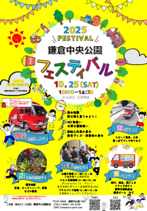 【鎌倉中央公園フェスティバル/鎌倉市緑化まつり】同時開催!ちびっ子電車、放水体験、ステージ演奏、工作、豚汁、焼き鳥、フライドポテト…親子一緒に秋の公園で楽しもう![2025年10月25日(土):鎌倉市]