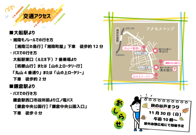 会場の鎌倉中央公園へは、大船駅からでも鎌倉駅からでもアクセスOK。湘南モノレールや江ノ電などを組み合わせて、会場へ向かうまでの道のりも楽しむのもいいですね♪