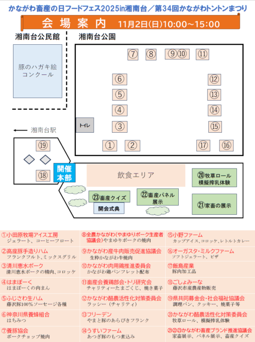 ジェラートアイス、コーヒーフロート、フランクフルト、ミックスグリル、清川恵水ポークのコロッケ・精肉、はまぽーくの肉まん、藤沢豚100%ソーセージ各種、はちみつ、ポークチョップ焼肉、やまゆりポーク焼肉、生粋かながわ牛焼肉、チャリティーたまごくじ、焼き菓子、ラッシー(チャリティ)、やまと豚のあらびきフランク、あつぎ豚のもつ煮込み、カップアイス、コロッケ、レトルトカレー、ソフトジェラート、ピザ、豚肉加工品、藤沢市産農産物販売、調理パン、クッキー、焼き菓子、牧草ロール、模擬搾乳体験、畜産展示、パネル展示、畜産クイズ