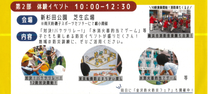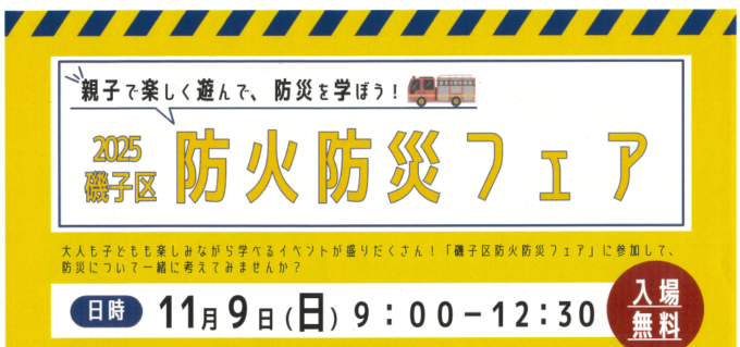 テーマは「身近なもので防災」。消防車もやってきます!こども防火服の着装体験はぜひこの機会に。また、災害時にも笑顔になれる手作りおもちゃコーナーなども。