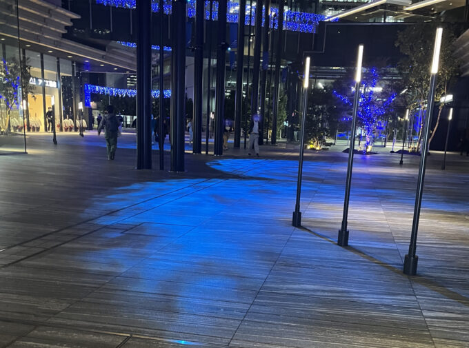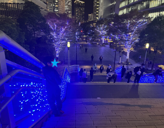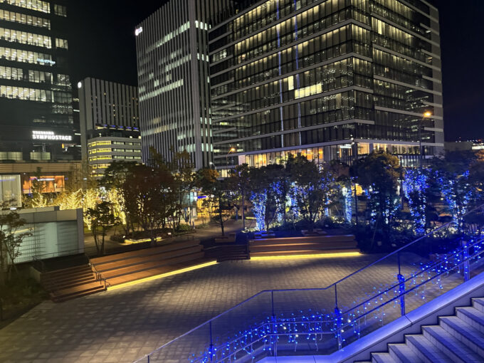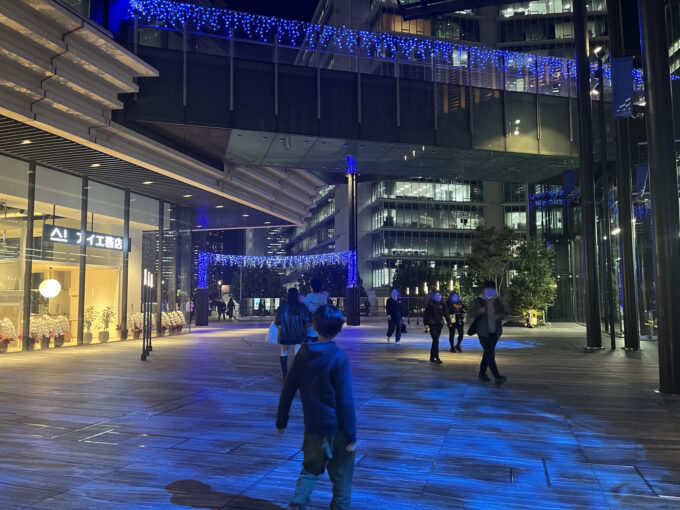 横浜グランゲートです。歩道橋にも、美しい青い電飾が施され、キラキラと輝いています。