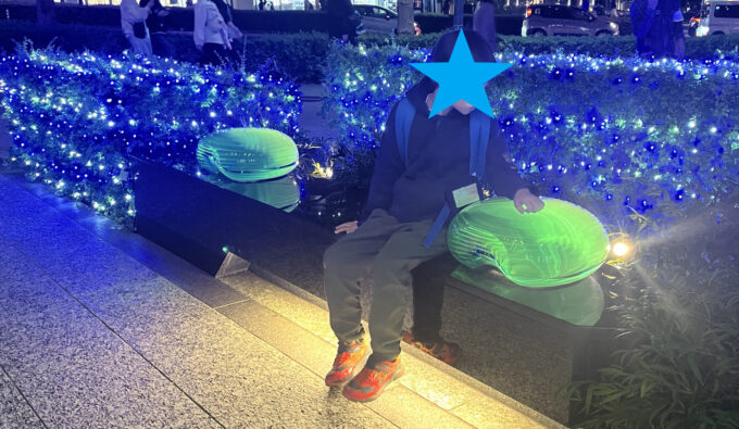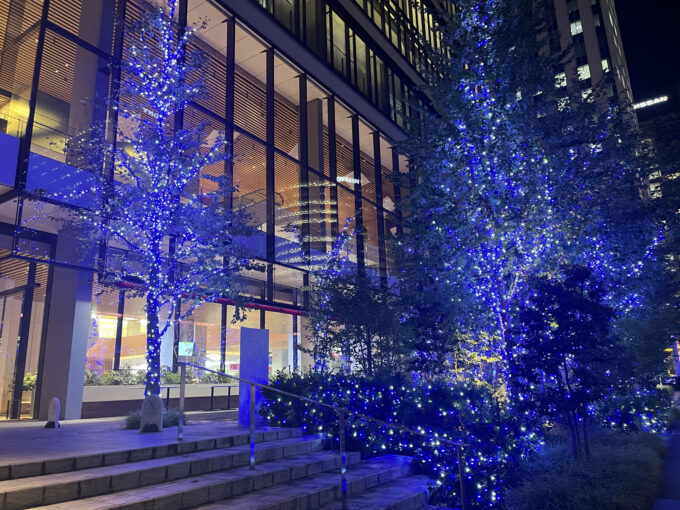 京急グループ本社ビル前にて。京急電鉄の電車型のベンチに腰掛けながら見るイルミネーション。