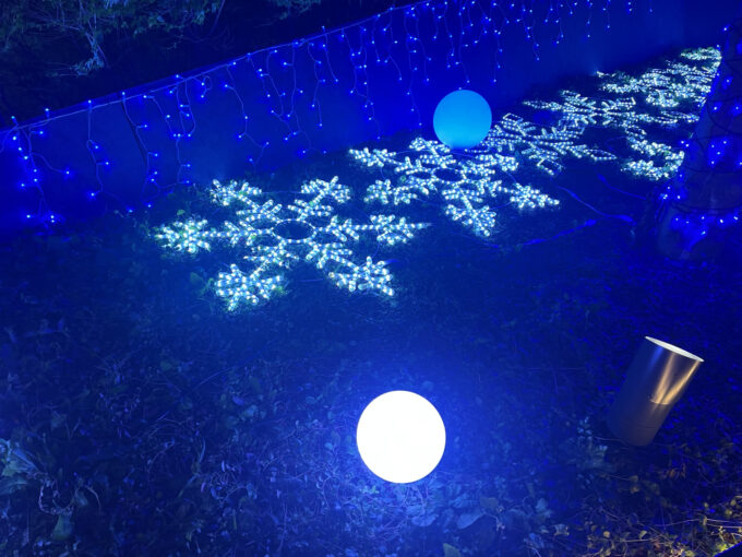 植え込みの中にも、雪の結晶のイルミネーションが淡く光っています。