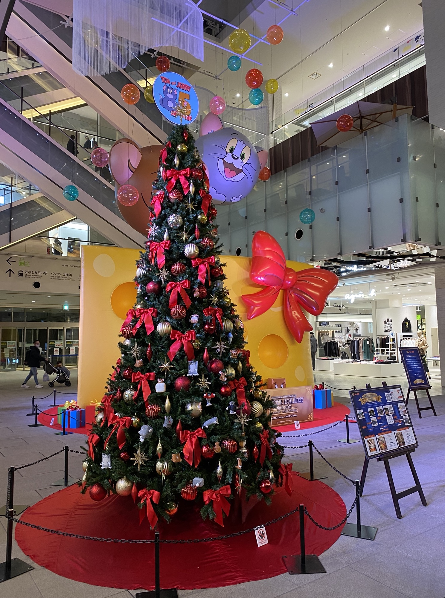 こちらの1階「グランドガレリア」にはクリスマスツリーと共に高さ約3.5mの巨大バルーンオブジェ「Tom and Jerry CHEESE GIFT」が登場しました。ジェリーの大好物である巨大なチーズと、風船のように大きく膨らんだトムとジェリーのバルーンなどは必見です。