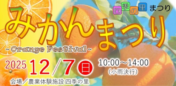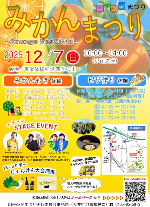 【四季の里~みかんまつり~】年に1度の収穫体験イベント!「みかんもぎ体験」参加者募集中!吉本芸人さんのステージ、ピザ作り体験、キッチンカーも出店♪大自然の中、親子一緒に楽しもう[2025年12月7日(日)大井町]