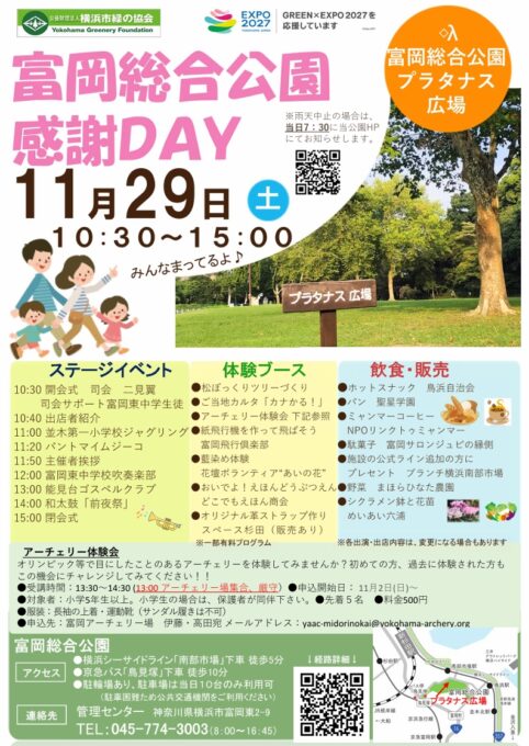 富岡総合公園をご利用・来園いただきありがとうございます。当公園利用者様に感謝を込めて富岡総合公園のプラタナス広場にて開催します。この機会に公園を知っていただきたく皆様のご来園をお待ちしています。爽やかな秋のひととき楽しんで頂けるように多彩な出店、体験プログラム、ステージパフォーマンスを用意してます。