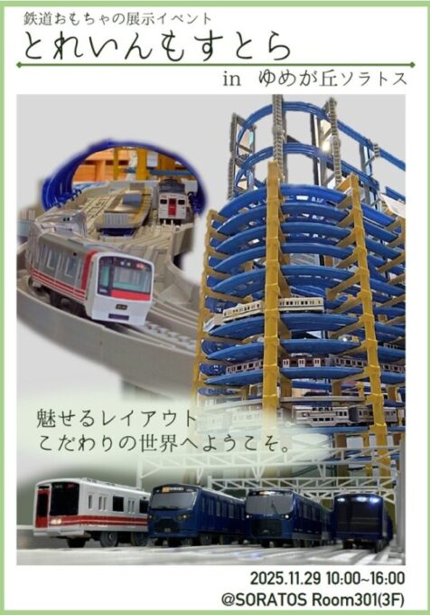 魅せるレイアウト。地元の車両が走る!そびえ立つ、でんしゃタワー!「とれいんもすとら」は、鉄道おもちゃを使った“見て楽しむ”展示型イベントです。子どもも大人も楽しめるオリジナル情景や車両が、あなたを待っています。他ではなかなか見られない“こだわりの世界”へ、ようこそ。”mostra”はイタリア語で「展示会」という意味です。従来赤いアメーバが運営するイベントは「とれいん」+「英語」の組み合わせでしたが、