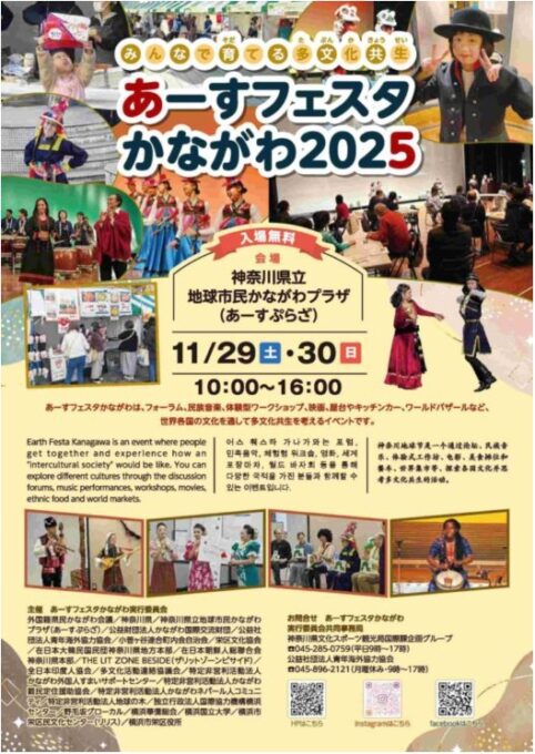 あーすフェスタかながわは、フォーラム、民族音楽、体験型ワークショップ、映画、屋台やキッチンカー、ワールドバザールなど。世界各国の文化を通して多文化共生を考えるイベントです。