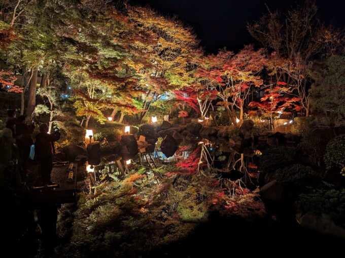 美しく紅葉したもみじや竹林をライトアップします。夜空に浮かび上がるもみじ、不動池に映る逆さもみじ、竹灯籠の灯りなどはとても幻想的で見るものを幽玄の世界へと誘います。 ※入場無料