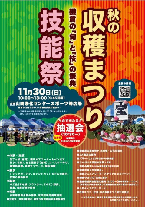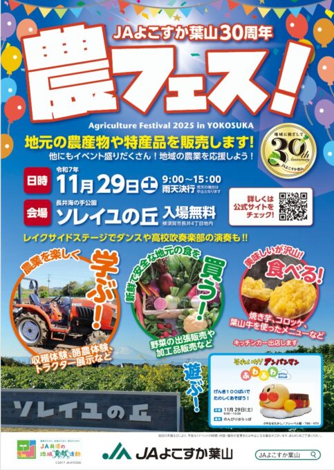 JAよこすか葉山設立30周年を記念し、長井海の手公園ソレイユの丘の協力のもと、新鮮な野菜の販売や収穫体験など、子どもから大人まで楽しめるさまざまな体験を通じて農業の魅力に触れて、知って、味わって、地域の食や自然の豊かさを再発見できるイベントです。 ※入場無料 ※事前申込・有料のイベントあり