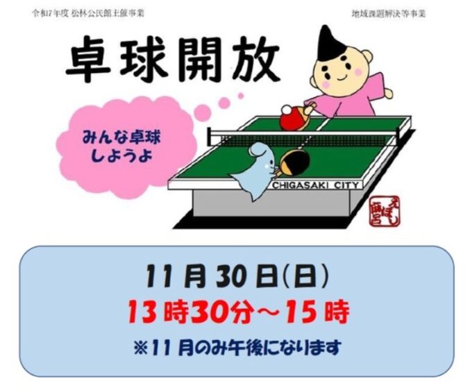 卓球を楽しみましょう。お一人でも初心者でも大歓迎です。混み合った場合は入れ替え制となります。 ※申込不要