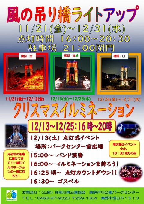 大自然の中、大きな吊り橋、水辺、BBQ場、遊具などが揃い、あそびいでも大人気の秦野戸川公園。11月21日~12月31日まで風の吊橋のライトアップを行っています。時期によりライトアップの色が変化。それぞれ異なる雰囲気が楽しめます(16:00~20:30点灯)。12月13日~25日の期間はパークセンター前広場でクリスマスイルミネーションも。クリスマスにちなんだ幻想的で可愛らしいモチーフは親子で楽しむのにぴったりです。12月13日(土)にはイルミネーション点灯式も開催され、ゴスペル隊によるクリスマスソングも披露されます。