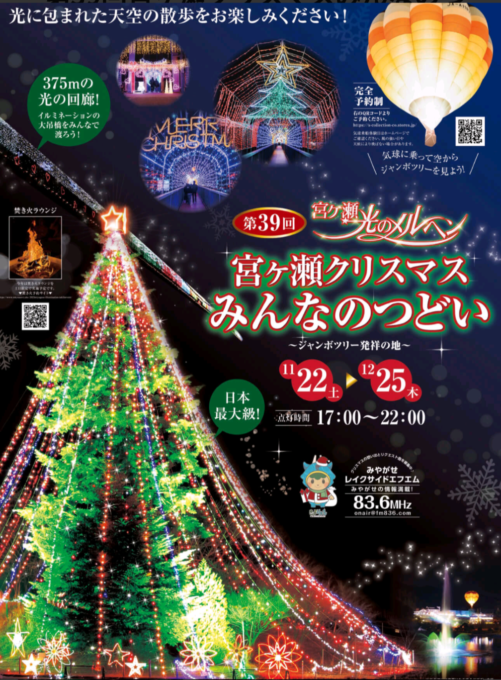 “ジャンボクリスマスツリー発祥の地”として知られる宮ヶ瀬の冬の風物詩となっているイベント。宮ヶ瀬湖畔園地内に自生する高さ30mを超えるモミの木をライトアップ。柔らかな光で包まれた巨大なツリーはとても幻想的です。会場では、イルミネーションにより「光の回廊」となった大吊り橋(全長335m)の湖上散歩、気球に乗船し空からジャンボツリーを望む宮ヶ瀬湖フライトなど、ここでしか味わえない体験も(事前予約制)。湖畔園地周辺は約72万球ものイルミネーションで彩られ、夜店も数多く出店期間中、ステージでは猿回しやクリスマスパフォーマンスなど楽しいイベントが目白押し、お祭り気分を味わえます。