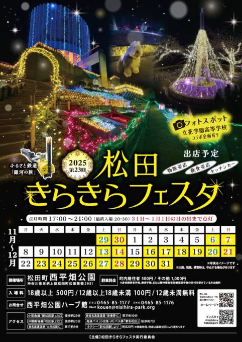 豊かな自然と相模湾や富士山が見渡せる最高のポジションにある「西平畑公園」。松田山ハーブガーデン、ふるさと鉄道(ポッポ鉄道)、自然の営みを教えてくれる自然館、子どもたちが楽しく遊べる子どもの館など、1日楽しく過ごせる公園です♪眼下に広がる足柄平野の夜景と華やかなイルミネーションを同時に楽しめる絶景ロケーションを堪能。光のじゅうたん、美しく装飾されたハーブ館など、園内に夢のような世界が広がります。ふるさと鉄道の夜間運行もありますよ♪物品販売、飲食販売、キッチンカーも。