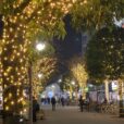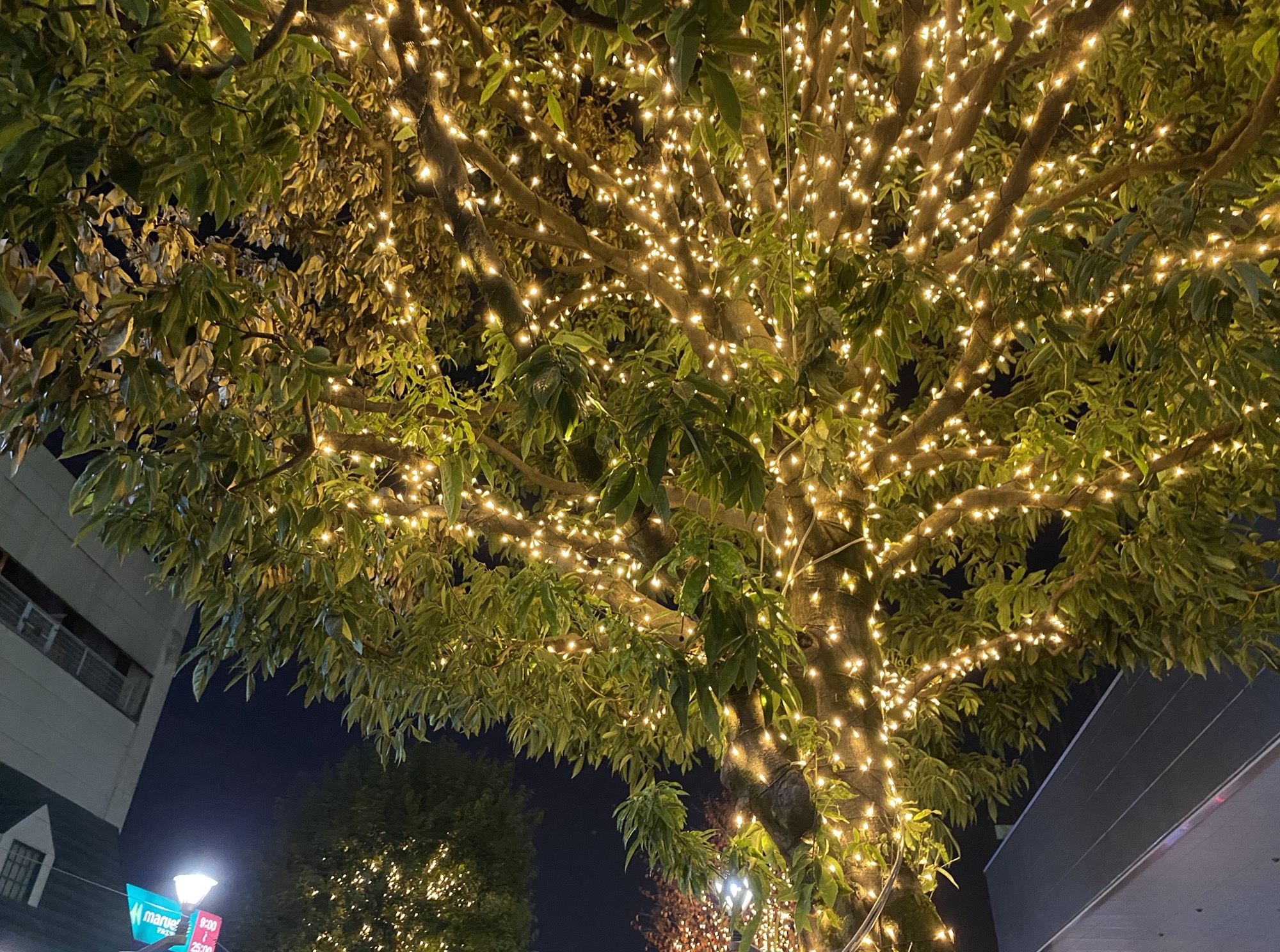 遊歩道の街路樹がイルミネーションで輝きます。ゴールドの色で統一されて、少し落ち着いた雰囲気です。