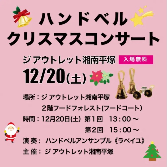 クリスマス向けの楽曲を中心にハンドベルの生演奏をお楽しみください。ハンドチャイムの体験コーナーもあります。 ※観覧無料