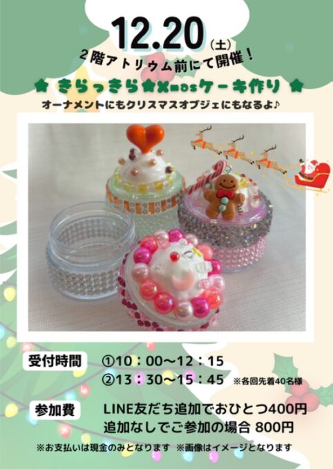 X’masツリーのオーナメントにもなる!きらっきらのデコケースづくりです。 ※各回先着40名 ※LINE友達追加でおひとつ400円、追加なしで800円