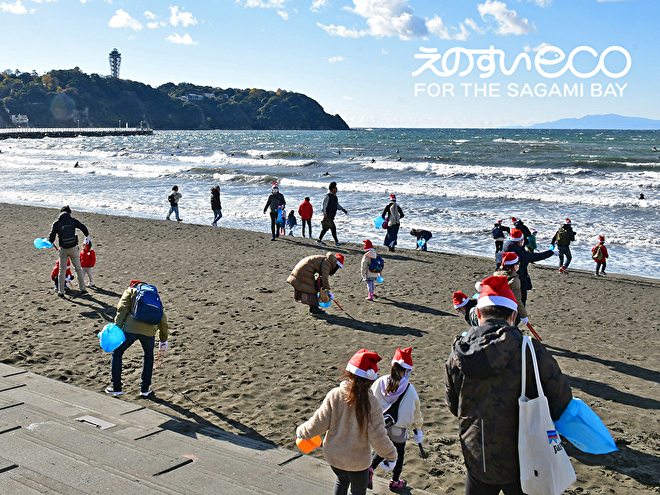 12月の「えのすいecoデー」はクリスマススペシャル!ビーチクリーンご参加の先着 200名さまに、サンタ帽をプレゼント!ごみ袋とトングを持ってきれいな海をプレゼントするサンタクロースになってみませんか?