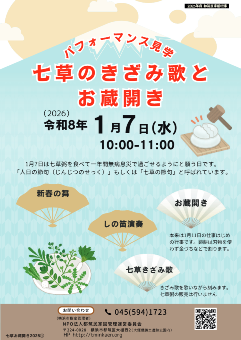 都筑区にある都筑民家園では横浜に残っている民家の中でかなり古いものである旧長沢家住宅を見ることができます。こちらのイベントでは七草きざみ歌、お蔵開き(パフォーマンス)、新春の舞などが楽しめます。