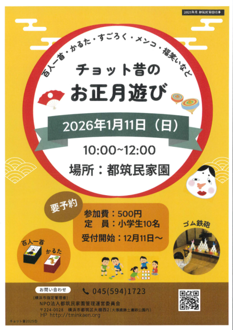 2026年1月10日(土)10時から、七草がゆと正月遊びの年始イベントが開催されます。コマ回しや羽根つき・かるたに加え、竹馬・竹とんぼなどの昔遊びも体験できます。また、11時から、先着70名様に、餅入り七草がゆ100円・甘酒50 円(先着150食)を提供いたします。申込は不要です。