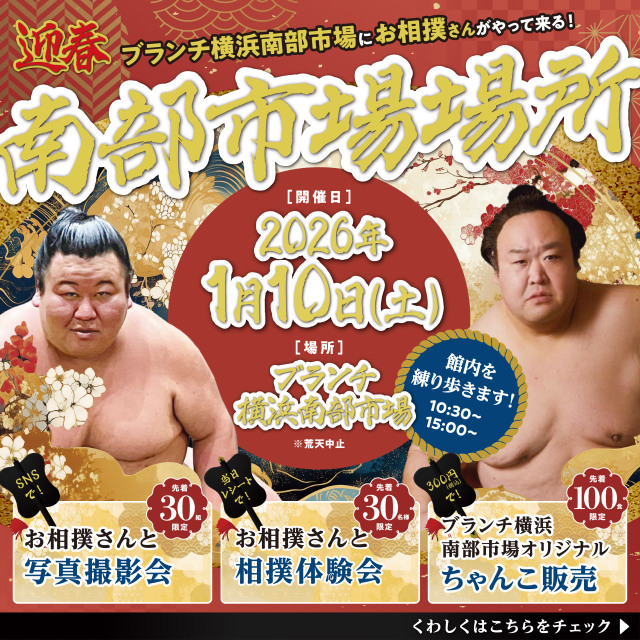 ブランチ横浜南部市場にお相撲さんがやって来る!新年を記念してお相撲さんと縁起の良い写真を撮影しましょう!スタッフがお客様の携帯電話で撮影します。