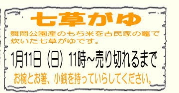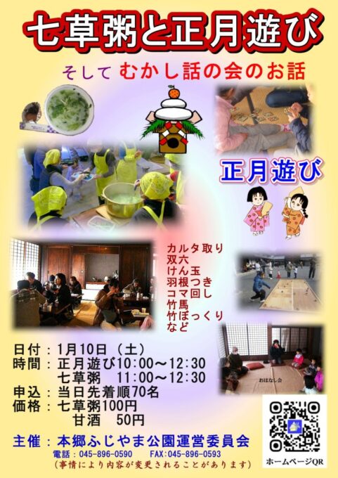 七草がゆと正月遊びの年始イベントが開催されます。コマ回しや羽根つき・かるたに加え、竹馬・竹とんぼなどの昔遊びも体験できますので、ぜひ遊びに来て下さい。また、11時から、先着70名様に、七草がゆ(100円)と甘酒(50円)を提供いたします。申込は不要です。例年、お孫さんと楽しむご家族の姿も見られます。当日はむかし話語りもありますのでお出かけください。
