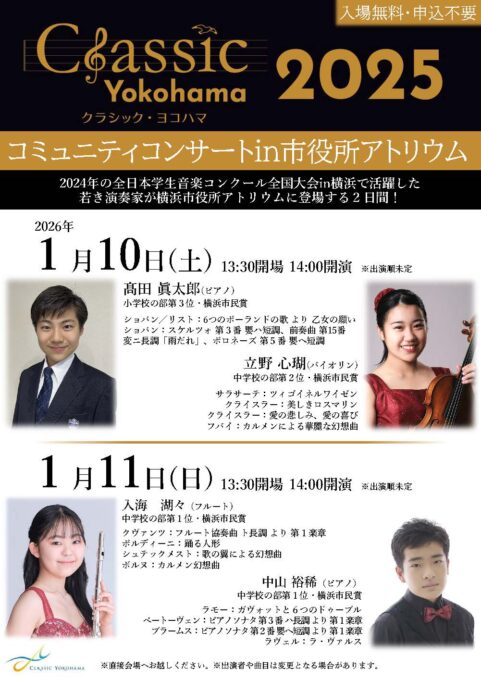 2024年の全日本学生音楽コンクール全国大会in横浜で活躍した若き演奏家によるコンサートを横浜市役所アトリウムにて2日間に渡って開催します。是非、ご来場ください。