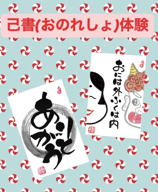 己書(おのれしょ)は、誰でも簡単に楽しく味のある字や絵を描くことができる人気の習い事です。書道でも絵手紙でもない、己の書。上手い下手は関係なく、個性を活かせる、楽しくてユニークな筆ペンアートです。簡単な己書の体験をしていただき、できた作品はお持ち帰りいただけます。すぐに飾ったり、人に贈っても喜ばれます。今回は節分の作品も描けます。