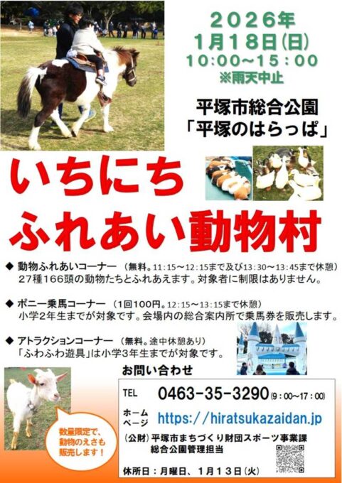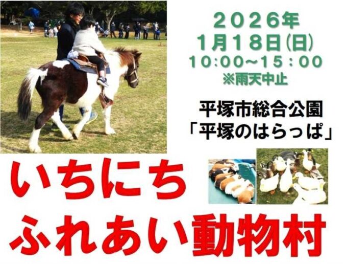 2026年1月18日(日)、平塚市総合公園内「平塚のはらっぱ」で「いちにちふれあい動物村」が開催されますよ♪