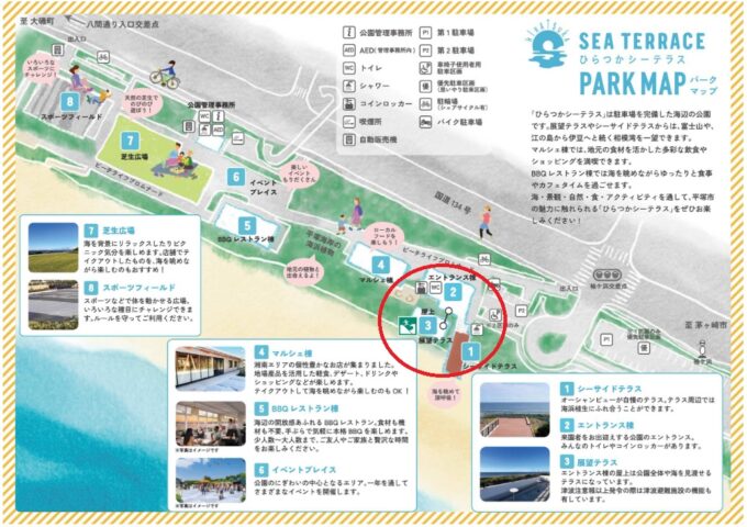 ご覧の通り、海沿いに細長く位置する「ひらつかシーテラス」。各スポットを順にご紹介しますね♪