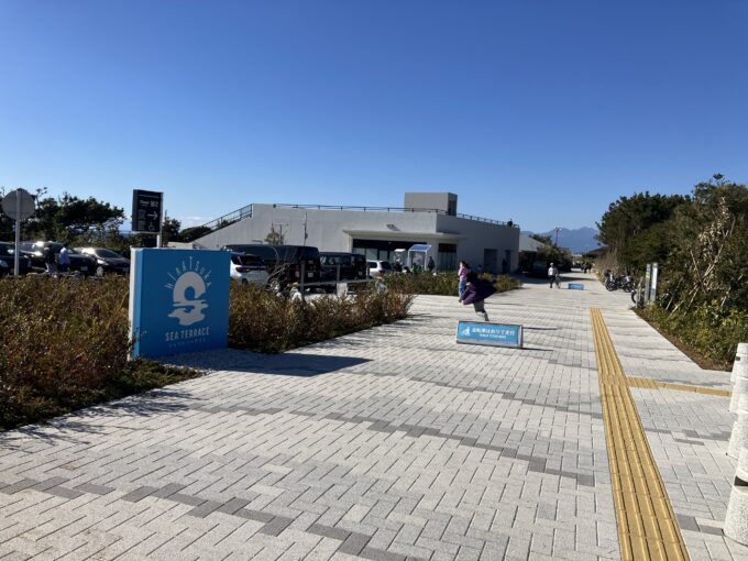 エントランスすぐの階段を上っていくと…まず目にするのが「シーサイドテラス」です。こちらはオーシャンビューが自慢のテラス。テラス周辺では海浜植生に触れ合うことができるのだそう。我が家は、この日はここでは止まらず、さらに上へと、このまま展望テラスへ直行しました。
