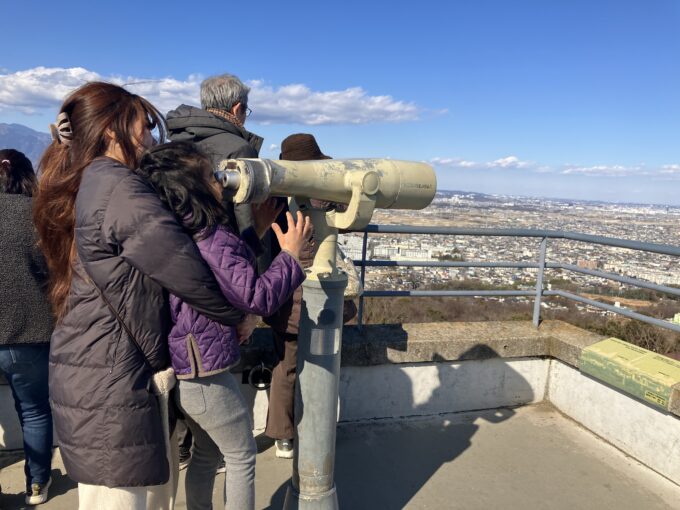 東京方面を眺められる望遠鏡が2基設置されています。無料とは、良心的ですね♪小さい子は難しいけど、ママがサポート。