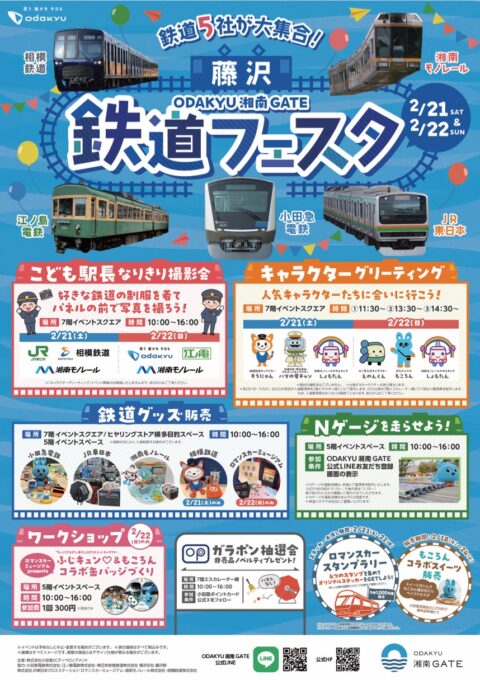 【藤沢 鉄道フェスタ】過去最大規模で開催!藤沢エリアに路線を持つ鉄道5社が初集結。なりきり駅長体験、Nゲージの運転体験、グッズ販売など、親子で楽しむ2日間!キャラクターも大集合♪[2026年2月21日(土)、22日(日) 藤沢市/ODAKYU 湘南 GATE]