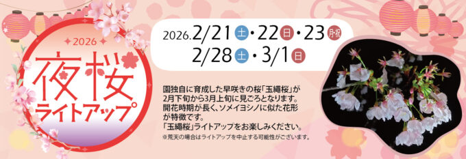 園が独自に育成した早咲きの桜「玉縄桜」が2月下旬から3月上旬に見ごろとなります。開花時期が長く、ソメイヨシノに似た花形が特徴です。「玉縄桜」ライトアップをお楽しみください。