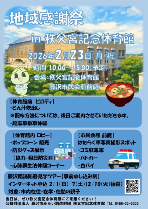 炊き出し(豚汁)無料配布(10:30~なくなり次第終了 先着400名、配布条件あり)、起震車乗車体験、ポップコーン販売、防災グッズ展示、警察車両(パトカー・白バイ)、パッカー車 展示など。藤沢南消防署探検ツアーは事前申込み(受付終了)。